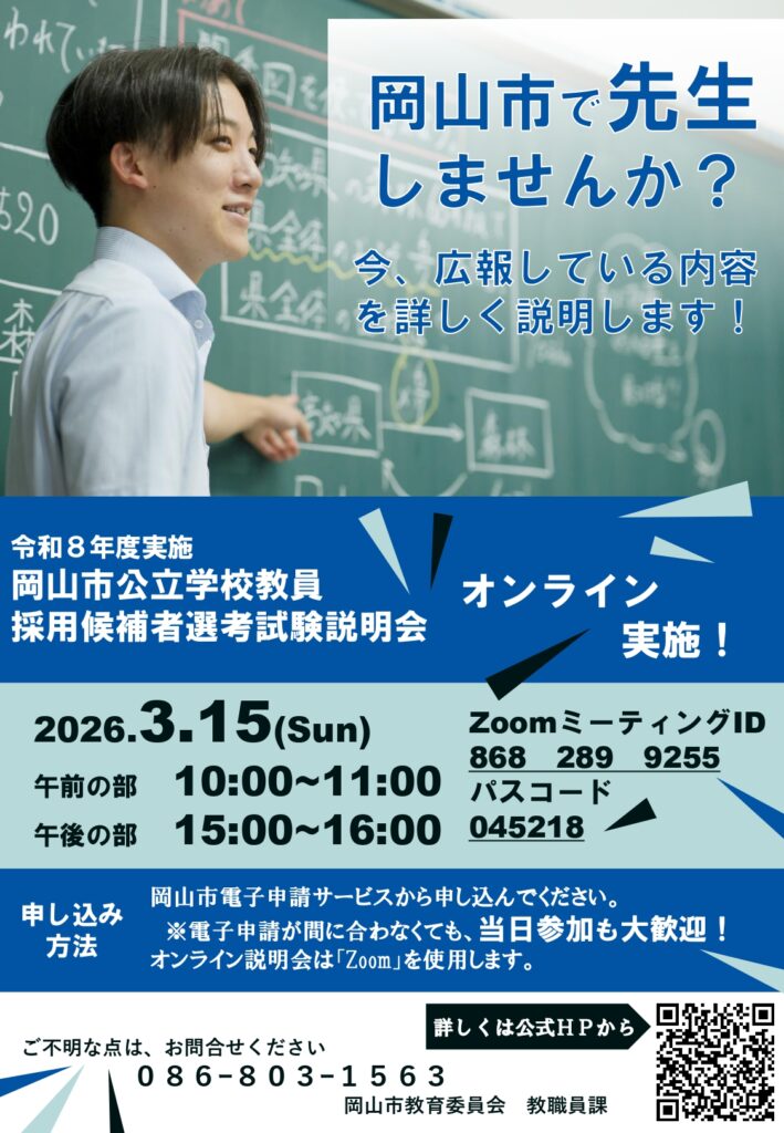 【岡山市公立学校教員採用候補者選考試験説明会】の案内(2026/2/18更新)
